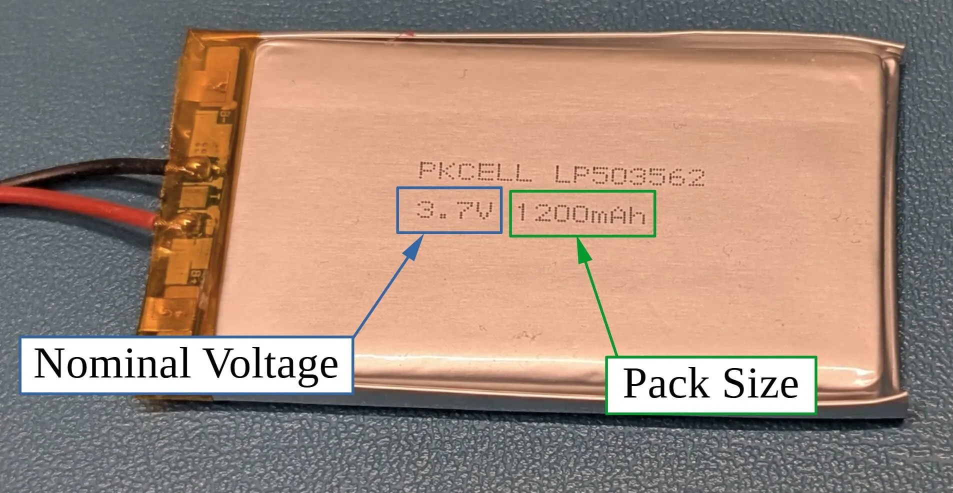 The pack size and nominal voltage of your battery is typically printed on the battery as shown below.
